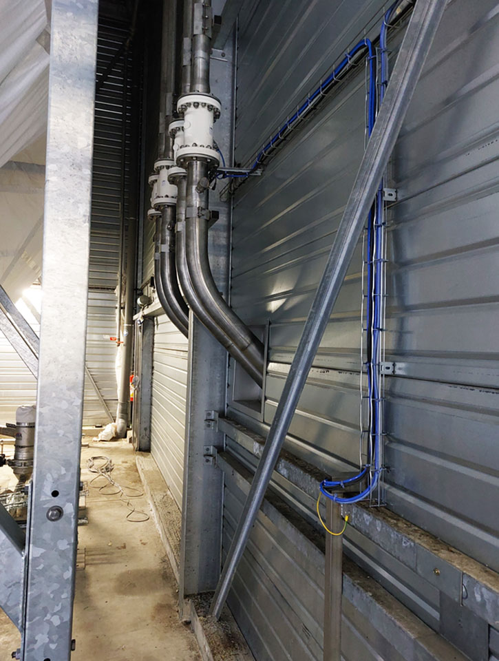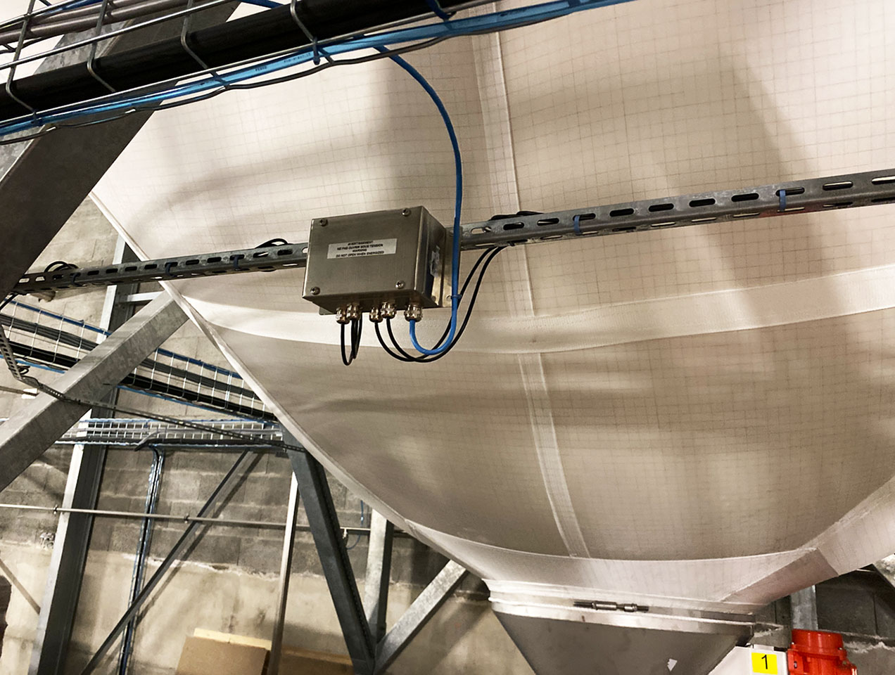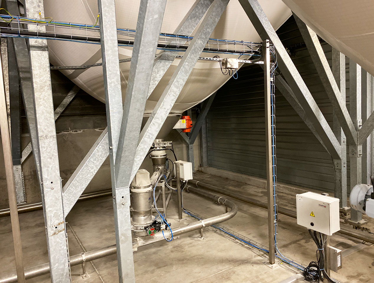 The flexible silos were specially designed to fit perfectly into the existing building, which was refurbished for the occasion. Each silo is made of galvanised tubes measuring 120 x 120 x 3 mm, which guarantee robustness and durability. The silos are equipped with high-precision weighing sensors, allowing for rigorous stock control. The load cells, each with a capacity of 10,000 kg, ensure optimal management of raw materials. An integrated safety system limits the unloading pressure to 0.8 bar, protecting both the equipment and the operators. Under each silo, dosing screws mounted on variable speed drives precisely dose the flour into the pneumatic transfer pipes. The dosing screws are mounted on an independent frame to avoid interference with the silo weighing measurements.