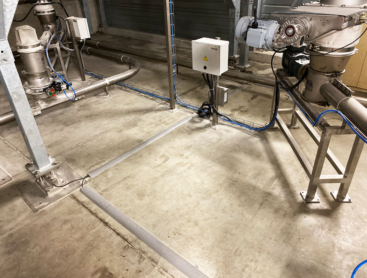 Pneumatic transfer ensures smooth and precise delivery of flour to the kneading machines. At the head of the network, a lobe blower with a capacity of 450 m³/h creates a vacuum in the pipes to suck up the flour. At the operator’s request, via the touchscreen interface located in the kneading room, the system starts up and transports the selected flour from the silos to the filter cyclones. The dosing screw located under the silos starts up and stops automatically when the required weight is reached, taking into account the weight loss due to the length of the circuit. Once the transfer is complete, the vacuum continues to leave the pipes perfectly clean and free of residue.