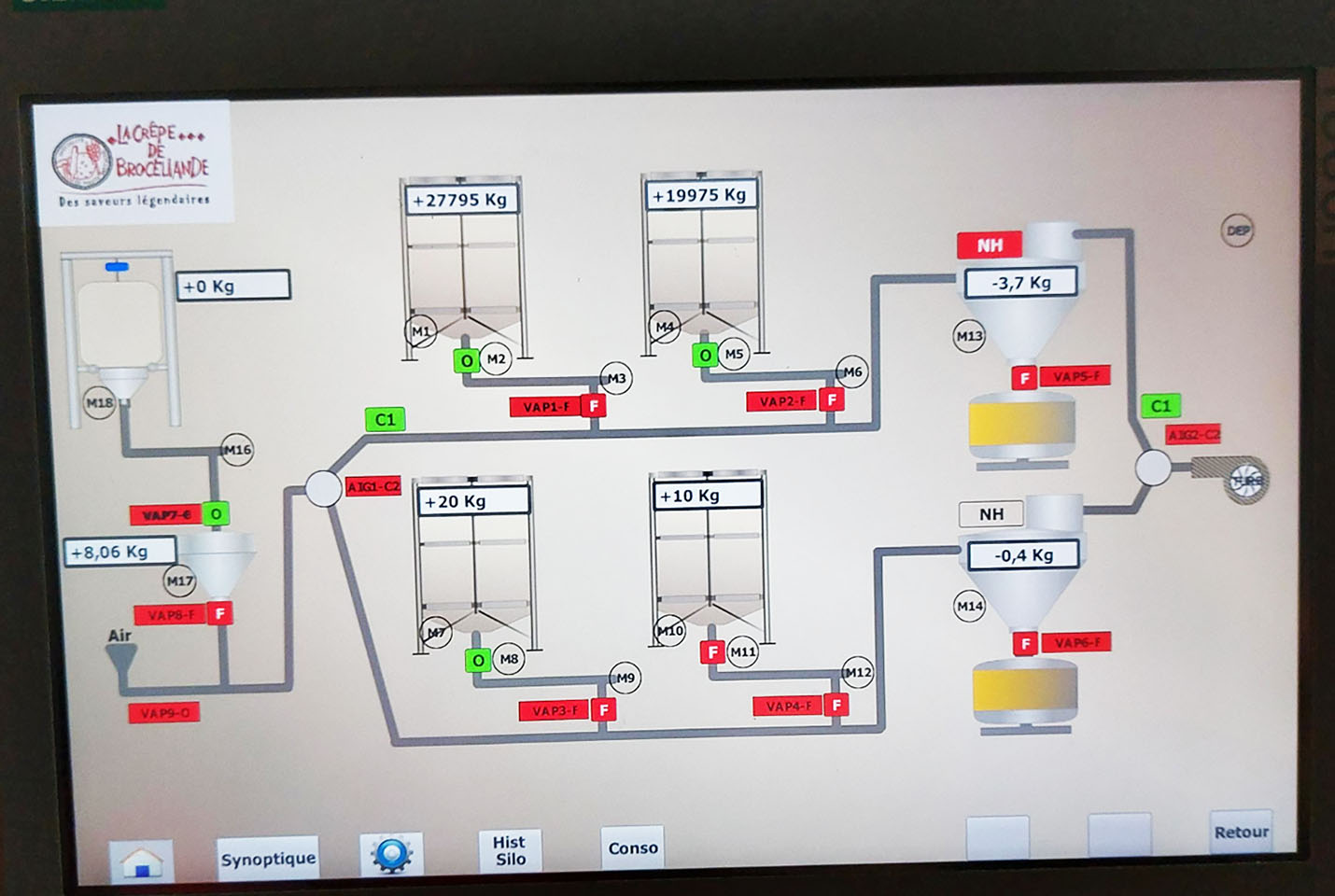 To meet our customer’s needs, Syvrac designed and installed a complete system. This system includes specially adapted storage silos, consisting of two 50 m³ silos for white flour and two 20 m³ silos for buckwheat flour. An standalone big bag emptying system allows for precise dosing of the salt needed to prepare the pancake batter. A pneumatic transfer system ensures the smooth, automated transport of the flour to the kneading machines via two separate lines. Thanks to an intuitive touchscreen interface, operators can select the necessary products according to requirements directly from the kneading room.