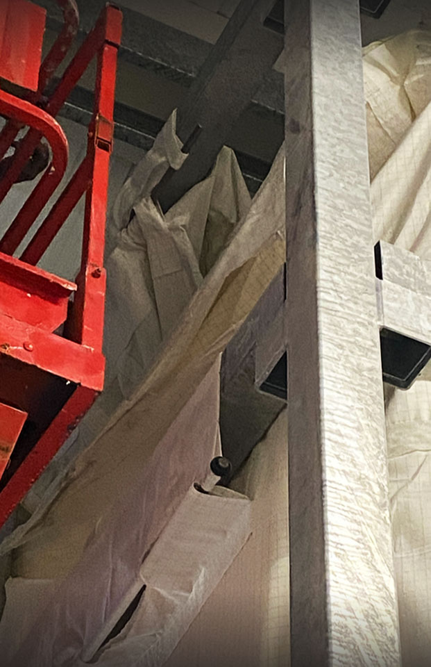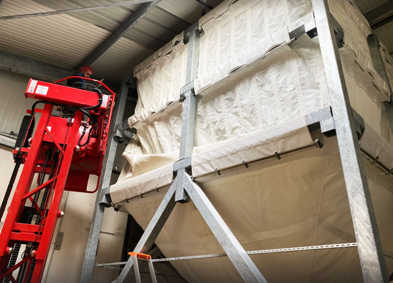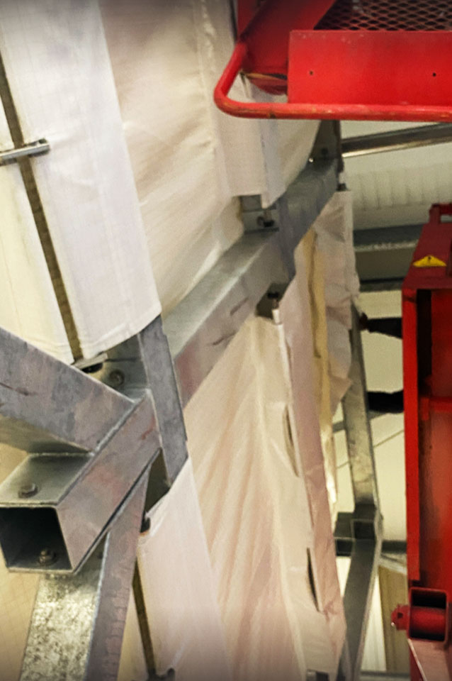 To overcome access difficulties, given the combined weight of the new and old tarpaulins, we opted to use a cherry picker. The layout of the site, which included equipment such as transfer screws, a sieve and a big bag emptier, made the use of cherry pickers more complex than during the initial installation.