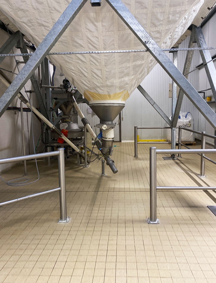 - An unloading network that allows silos to be loaded from the dock using a pneumatic truck, ensuring speed and efficiency. A pressure sensor limits the unloading pressure to 0.8 bar and a light cylinder with audible alarm alerts the driver if the pressure setting is exceeded.