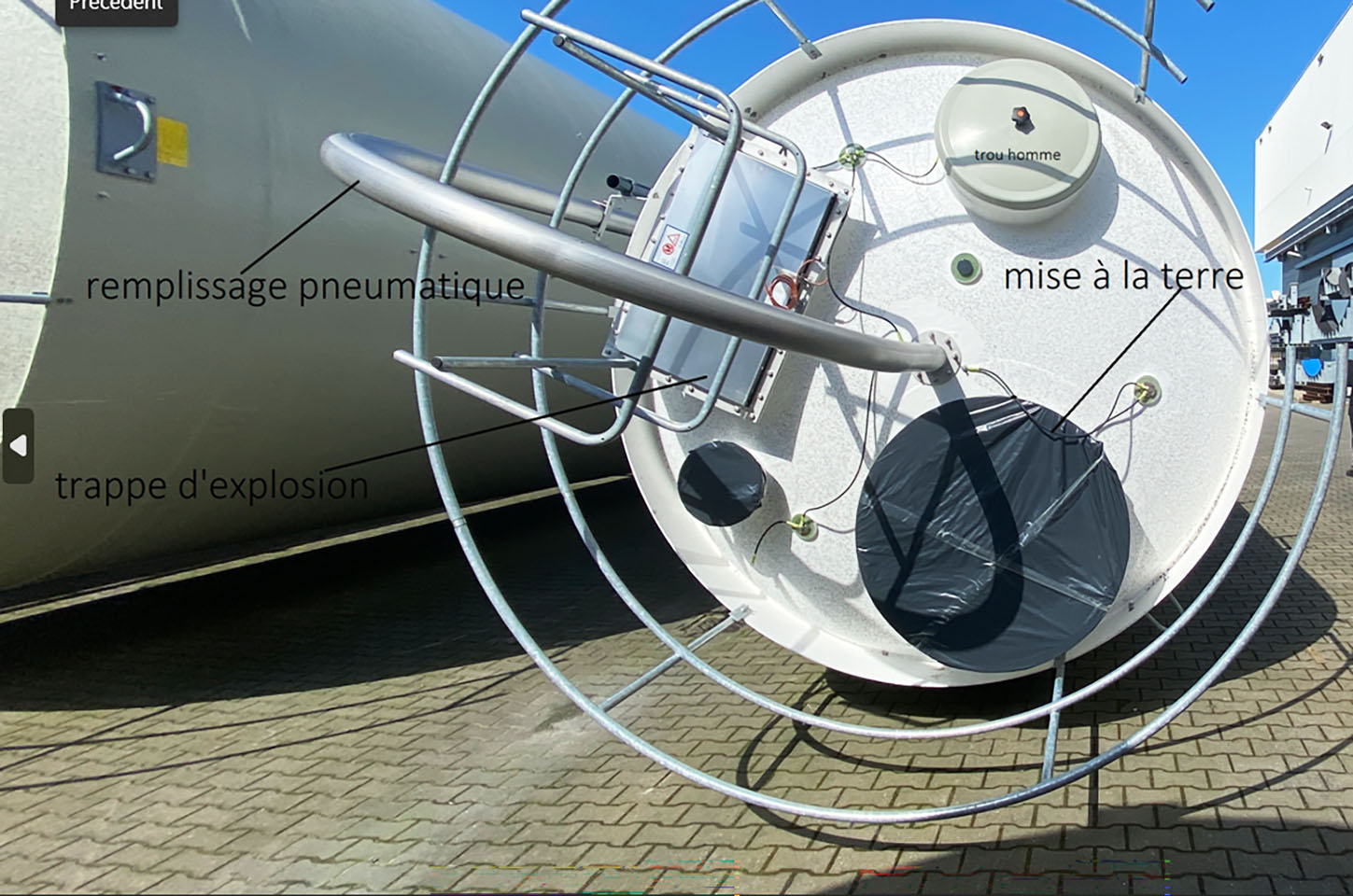 The silo is equipped with an 18 m³ stainless steel filter, with an automatic cleaning system controlled by a PLC. This filter ensures optimal air quality and prevents the risk of contamination. In addition, the silo is equipped with a breakaway panel in case of flour dust explosion, thus ensuring compliance with the ATEX standard and ensuring operational safety. A manhole is located on the roof to allow access for qualified personnel working at height, thus facilitating the annual cleaning of the installation.