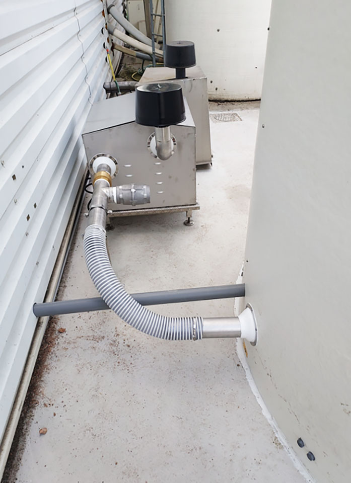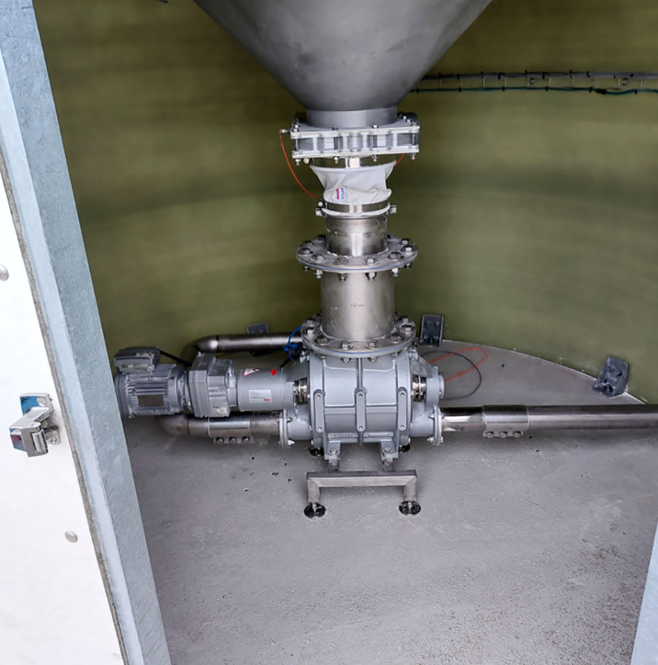 A pneumatic transfer network has been installed under the new silo, with an integrated connection to the existing silo. This system enables efficient, automated transfer of flour. With each delivery, the new flour is stored in the new silo. When the low-level sensor installed in the old silo detects a shortage of product, the system automatically triggers the transfer of flour from the new silo to the old one. This transfer is carried out in a single operation and takes 3½ hours to complete, thus ensuring uninterrupted production continuity.