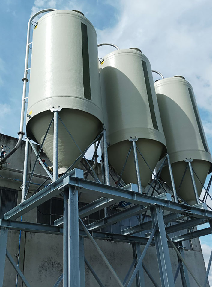 We offer high-performance polyester composite silos, specially designed for the storage of products such as offal. These silos are installed on a robust IPN structure (wide-flange I-beams), which allows for quick and efficient unloading thanks to an optimised passage for lorries. This configuration greatly facilitates logistics operations and reduces handling times.