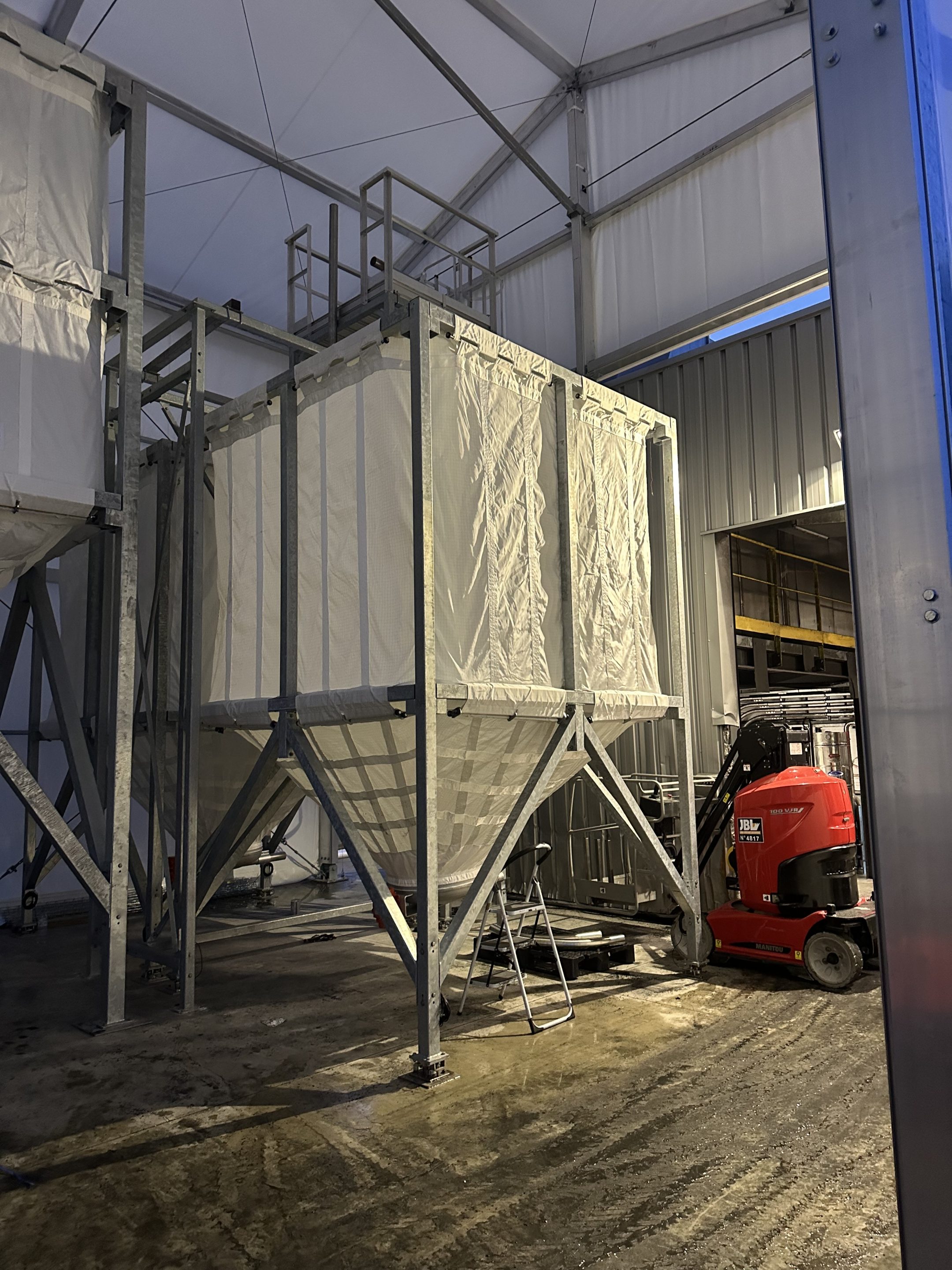 Our client chose to expand its infrastructure by adding an industrial marquee to house all of the storage silos. Among these installations, a 61 m³ flexible silo was specially designed to perfectly match the factory’s production capacity.