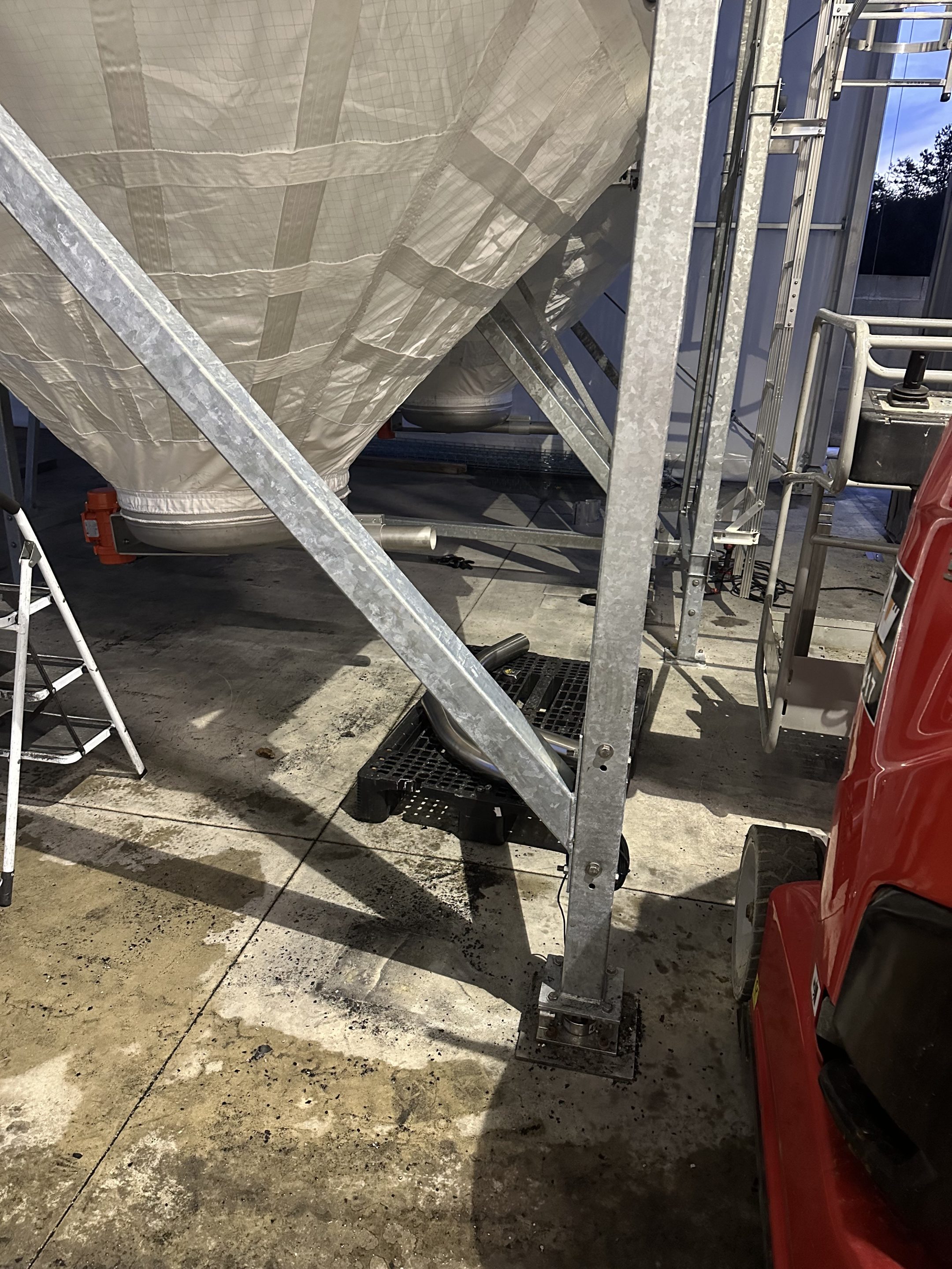 - To avoid disrupting weighing due to the weight of the transfer screw motor resting on the weighing silos, an independent structure has been installed. This solution allows the weighing silos to be covered without exerting physical stress on them, thus preserving their accuracy.