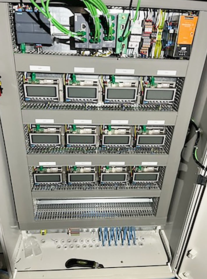 - Four 20-tonne double shear load cells are installed between the compression interfaces. These load cells are calibrated in collaboration with the manufacturer to ensure optimum accuracy. The data is transmitted via I40 displays, allowing the customer to monitor the weight of the products in real time via a communication gateway. The sensors are positioned on load plates attached to the legs of the silos, ensuring weighing stability and accurate readings.