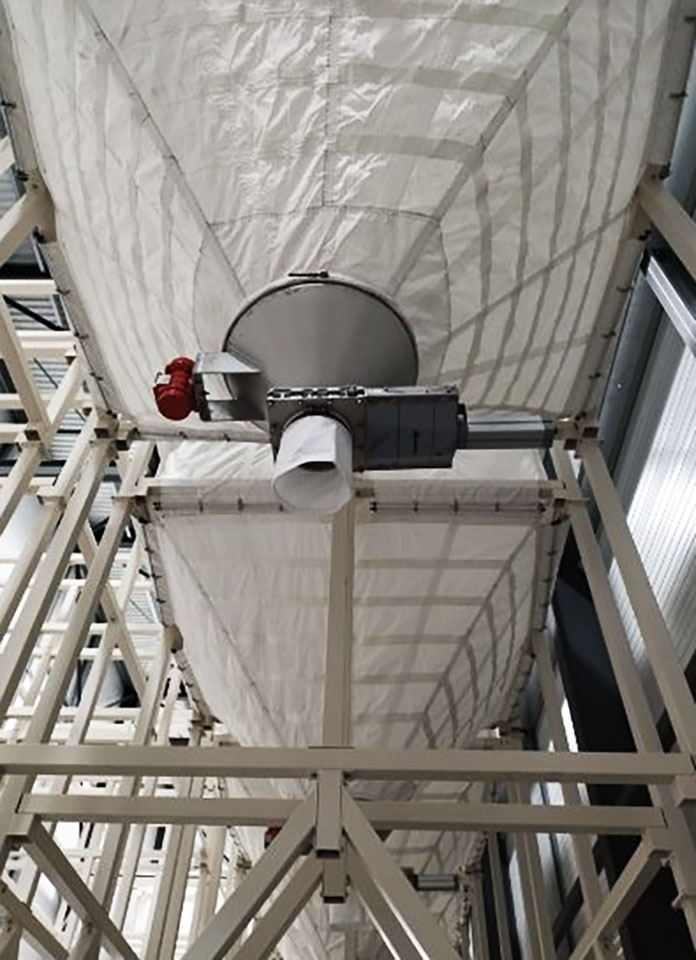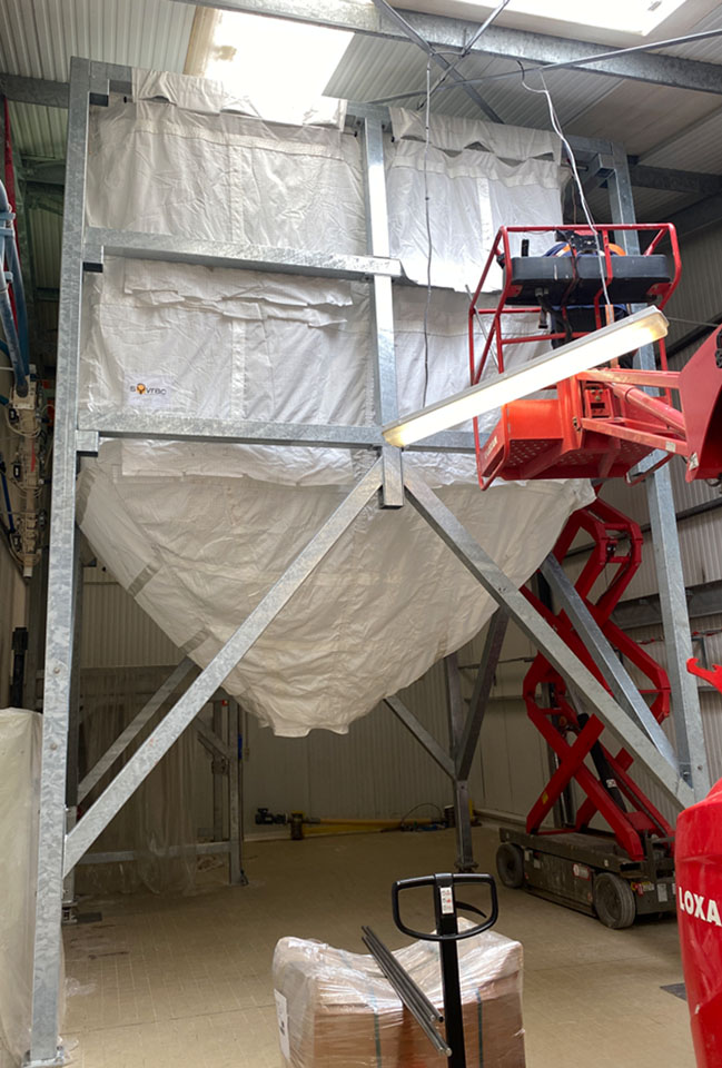The solution proposed by Syvrac is based on the installation of 12 flexible silos, each with an individual capacity of 51 m³, allowing for a total storage capacity of over 600 m³. This system provides great flexibility in supplying the packaging lines while ensuring accurate real-time stock monitoring thanks to a Précia Molen weighing system.