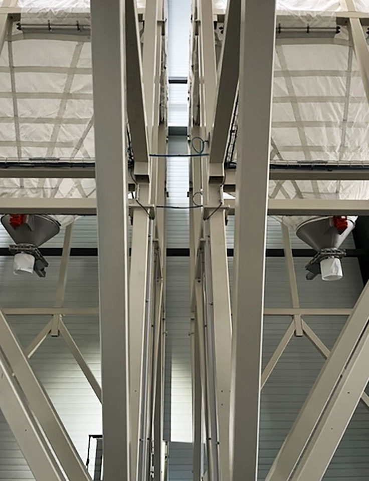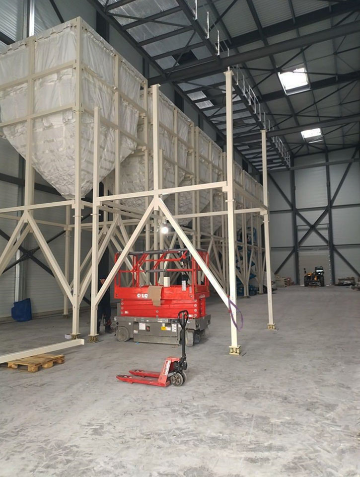 Our customer’s main objective was to ensure that the storage areas complied with current food standards. Two initial solutions were considered: stainless steel silos or sheet metal silos with food-grade paint applied to the interior. However, installing these silos would have required them to be lifted over the building due to the installation of an intermediate frame, which would have limited their capacity compared to alternative solutions.