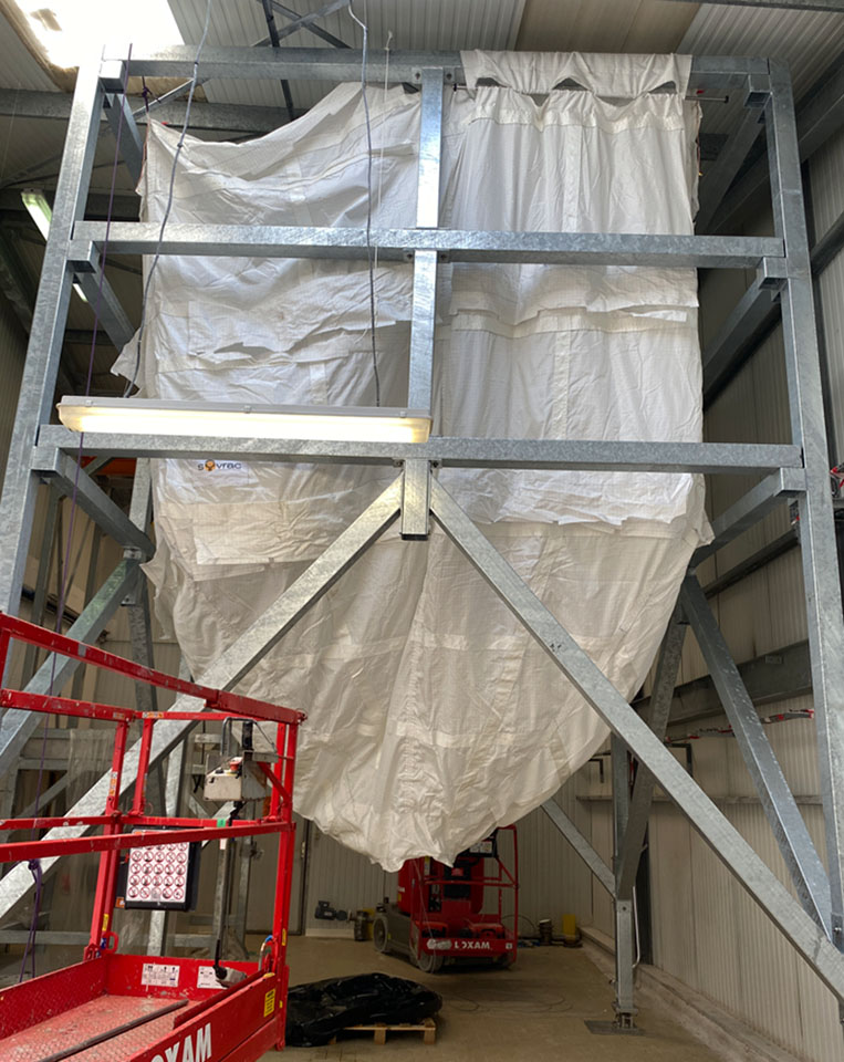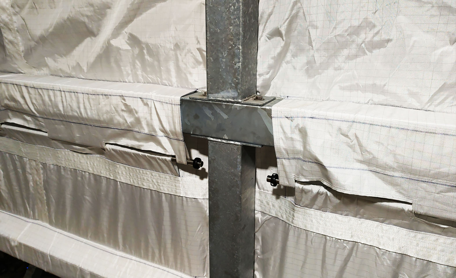 The silo’s metal frame, weighing approximately 3 tonnes per unit, is made of 120 mm x 120 mm square tubes with a thickness of 5 mm, ensuring optimal stability. The legs, divided into three sections, facilitate production, transport and on-site assembly. In addition, the 4,600 mm ground clearance allows for efficient gravity emptying into the recovery system. - To prevent the risk of buckling of the legs, a horizontal level has been added between the ground and the first attachment point of the canvas. This device, reinforced by eight integral braces, effectively distributes the loads on the ground. Finally, a load study is systematically carried out before each installation to validate the concrete foundations.